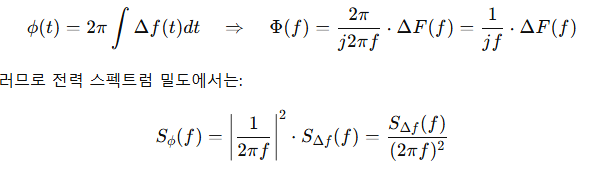 주파수 노이즈가 위상 노이즈로 변화하려면 spectrum은 *(2πf)^2로 나뉜다