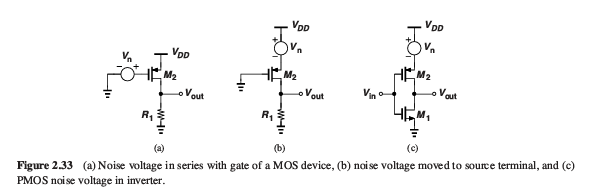 b) 회로 해석편의를 위해, channel length modulation이 무시가능할 경우 이 노이즈 전압Vn을 소스단자에 이동시킬 수 있다. 이는 Common gate 로도 해석 가능하며 Vn이 동일하게 증폭되어 출력에 영향을 준다.